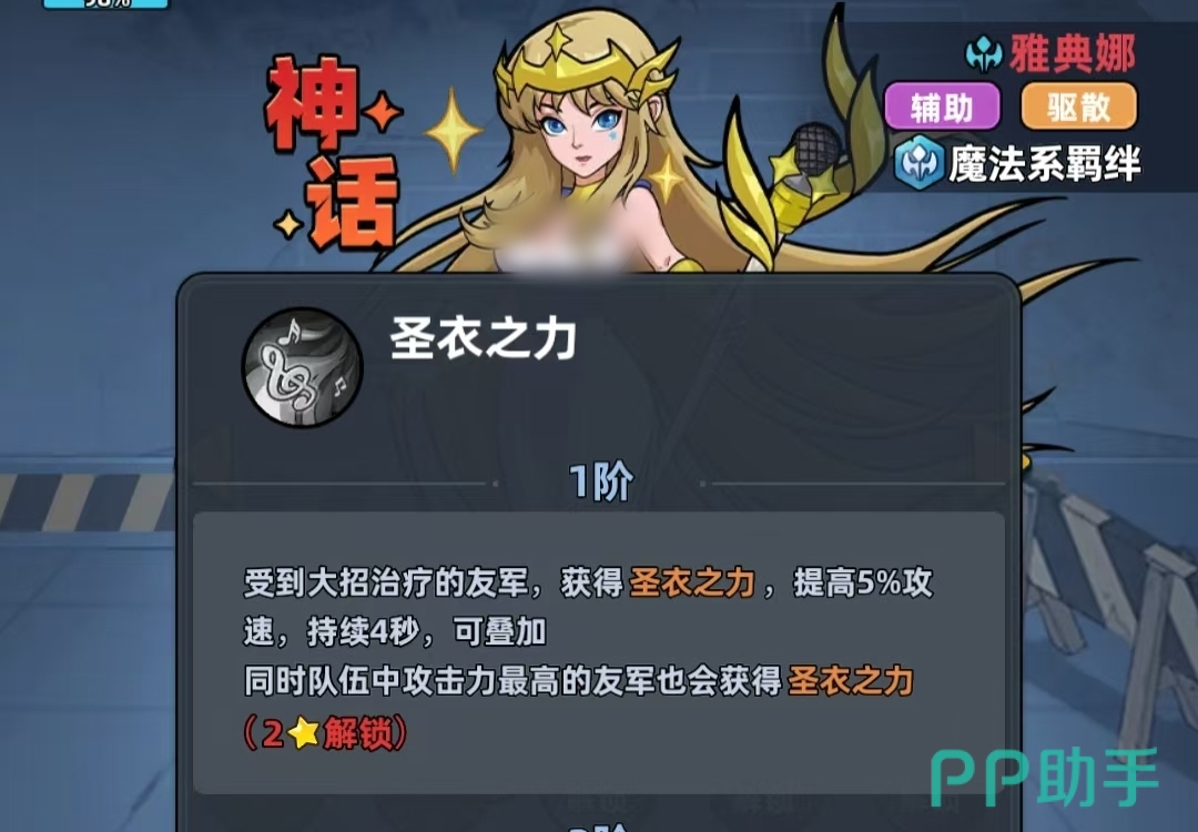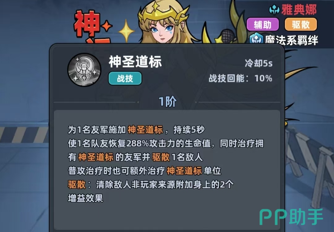 基础生存层面,雅典娜自带两项被动特性:全局10%减伤效果,以及额外10%格挡率加成。这使得她在前排承伤或侧翼支援时具备远超常规辅助的站场稳定性。其战技具备三重战术作用——首先,随机为一名友方单位施加持续5秒的“神圣道标”;其次,在对任意队友释放治疗时,该次治疗效果将同步覆盖所有带有神圣道标的友军;最后,每次施放战技还会随机清除一名敌方目标身上的两种增益状态。值得注意的是,随着星级提升,该技能的治疗倍率呈阶梯式增长,而非线性叠加,高星阶段提升尤为显著。