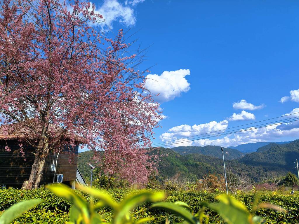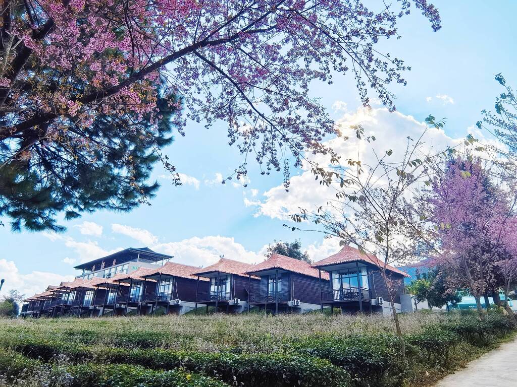 除了城市周边的樱花景观,藏于茶山里的景致也更添几分韵味。在勐甘村帕棚自然村,天润茶厂打造的茶海云端民宿,静静坐落于千亩茶园之间。推窗而望,粉樱点缀层层茶陇的诗意画卷尽收眼底,自然肌理与人文底蕴交融的和谐之美扑面而来,让这里成为游客体验慢生活的优选之地。