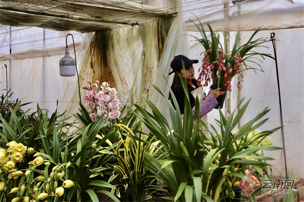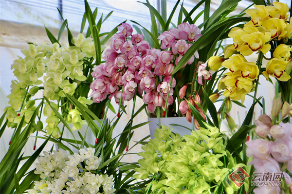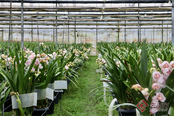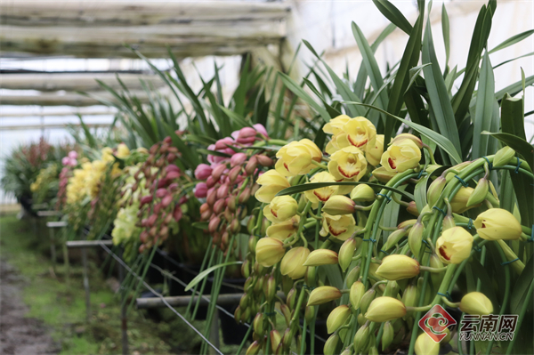 近日,走进嵩明县杨桥街道,成片温室大棚里热气氤氲,一盆盆大花蕙兰排排站立,叶片油亮挺拔、花苞鼓胀饱满。在街道大村子社区嵩明博源农业科技有限公司的温室大棚内,8万盆大花蕙兰在工作人员精心呵护下,呈现一片五彩斑斓的花海。公司负责人李永明正穿梭在花架间,他的目光停留在一株名为“爱恋”的新品上。不同于传统年宵花一味追求的大红大紫,这株兰花呈现出一种柔和而高级的粉色,在阳光下显得格外娇艳。