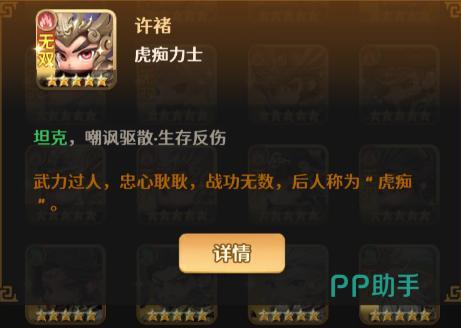 许褚,以“虎痴”著称,在格斗三国志中也是继承了其历史形象,必然会有着强劲的输出和防御能力,通常是受击反伤这种,运用得到可以给队伍带来极高的收益,如果还有其他擅长反击的武将还可以组成反击队。