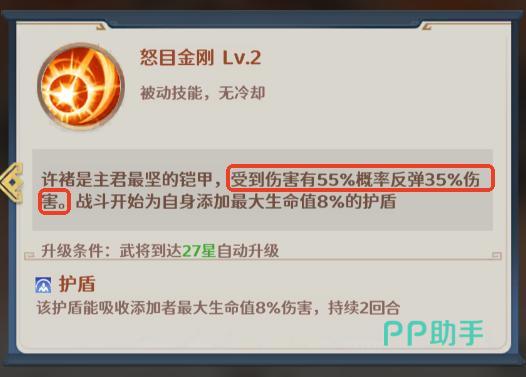 被动技则是提升许褚一定的入战免伤,并在回合结束后对随机敌人造成许褚自身血量3%的真实伤害。另一个被动技则是在受到伤害的时候有55%概率反弹35%伤害,入战给自己挂上最大血量8%的护盾。