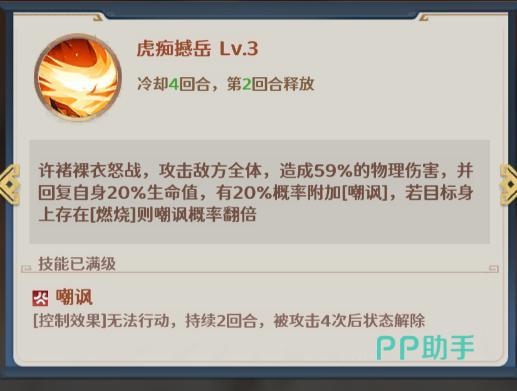 然后是其大招“虎痴撼岳”,全体攻击,虽然攻击倍率不算高,但可以回血20%最大血量,并且有20%几率附加嘲讽,如果目标已经有被挂燃烧状态,那么嘲讽的概率翻倍。在格斗三国志里嘲讽效果还是很强的,会持续2回合并且被攻击4次后才会解除。