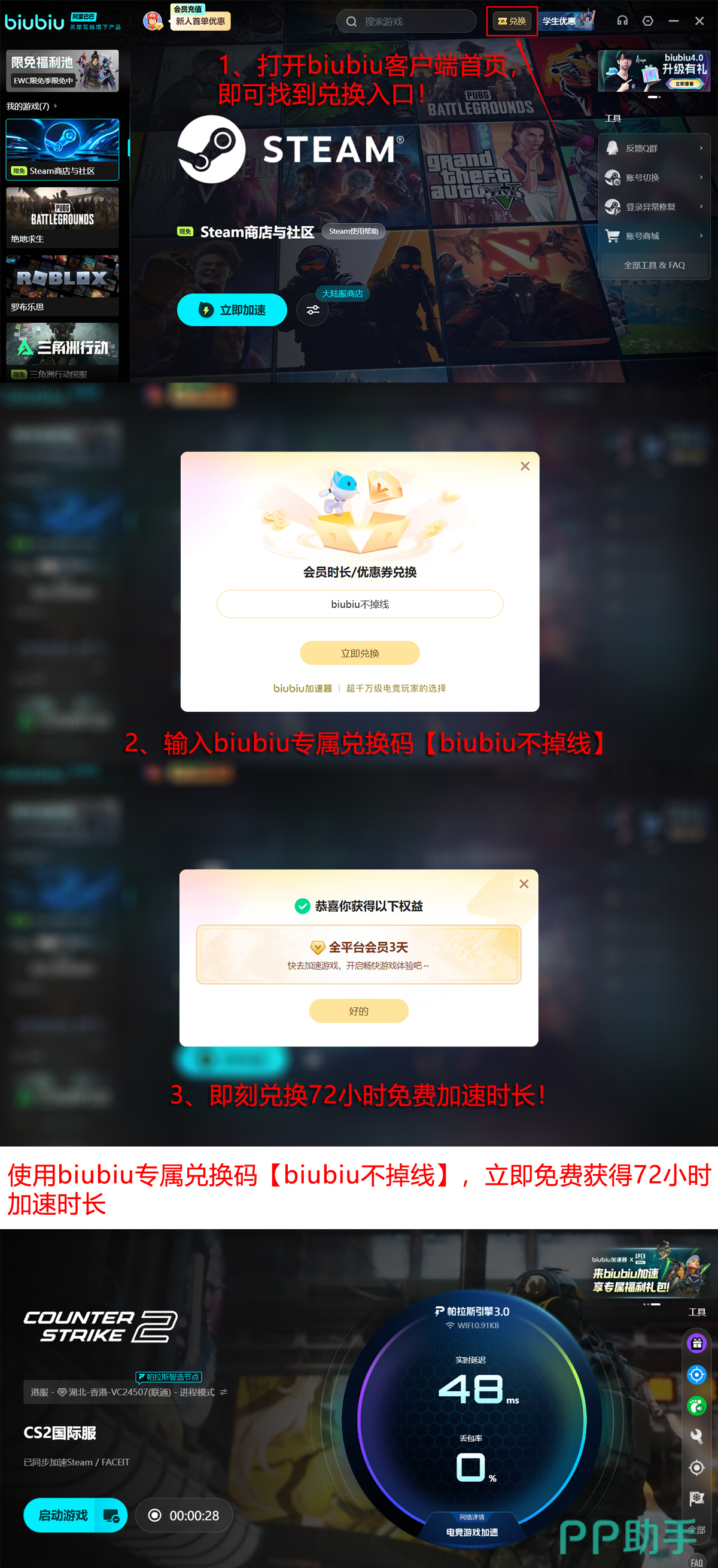 现输入激活码【biubiu不掉线】即可在平台内直接领取3天免费使用时长;完成新用户注册后额外赠送24小时,累计达96小时,充分覆盖高强度训练与排位周期。