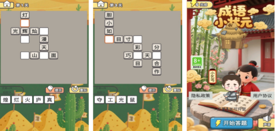 以成语知识体系为内核,主打填空式接龙训练。每个关卡提供残缺成语(缺失1–2字),辅以下方滚动汉字池。玩家需结合语义逻辑、语法结构与常见搭配进行精准补全。题库覆盖中小学课标成语及高频实用表达,难度随进度动态提升,支持错题回顾与释义查看。