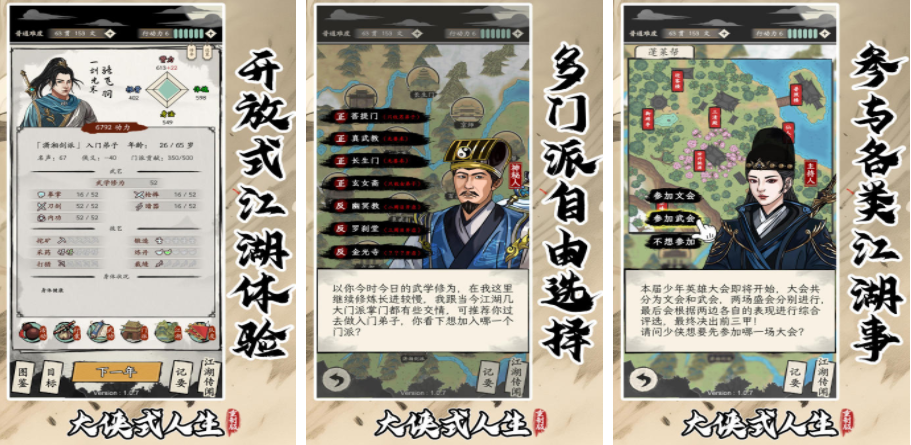以武侠人生模拟为核心机制,玩家开局即入江湖,可自由择选少林、武当、峨眉等十余个门派,各派设有专属武学谱系、门规任务与师徒传承体系。除习练经典招式外,支持功法拆解、组合与自创,形成千人千面的战斗风格。NPC拥有独立人格与行为逻辑,可结义、结仇、联姻或共闯险地,重大江湖事件如华山论剑、魔教围攻等亦会依玩家行动动态触发。