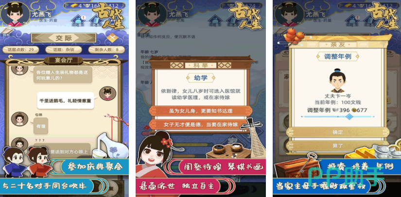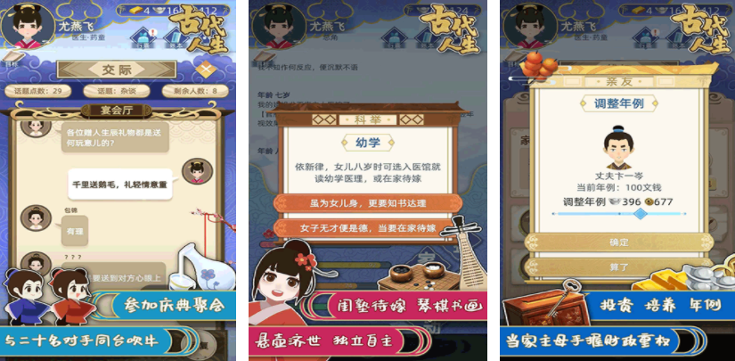 采用全生命周期叙事框架,玩家将从襁褓婴儿阶段开始,经历成长、求学、立业、成家等完整人生阶段。职业体系覆盖农、工、商、仕四大方向,每条路线均有独立成长模型与事件触发逻辑。通过日常对话、节庆活动、宗教参拜等方式提升智、体、德等基础属性,属性变化将直接影响事件选项开放、人际关系演进及结局分支走向。
