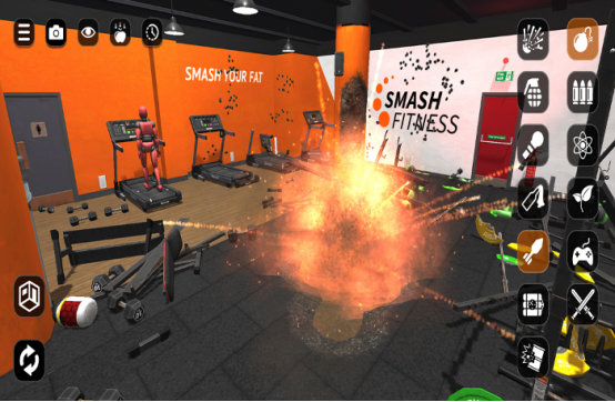 主打沉浸式室内破坏体验,提供健身房、实验室、办公室、卧室等8类主题房间。武器库包含近战类(铁棍、消防斧)、远程类(手枪、狙击步枪)及环境道具(燃气罐、电箱),不同组合可触发独特连锁效果。所有物品均按真实重量与硬度建模,玻璃碎裂轨迹、墙体开裂纹路、家具翻倒角度均符合物理规律。