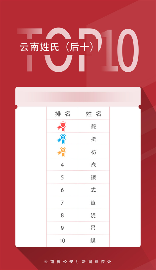 云南网讯(记者 赵岗)2025年云南省名列前茅的姓氏有哪些?2025年出生并已经进行户籍登记的新生儿名字使用频率最高的是哪个?最少的又是哪个?近日,云南警方公布2025年云南省姓名报告(根据使用人数进行排名),云南百家姓排名、云南姓氏排名中,“李”姓排第一,全省有580多万人。最少的姓氏为“舵”姓,全省仅一人。