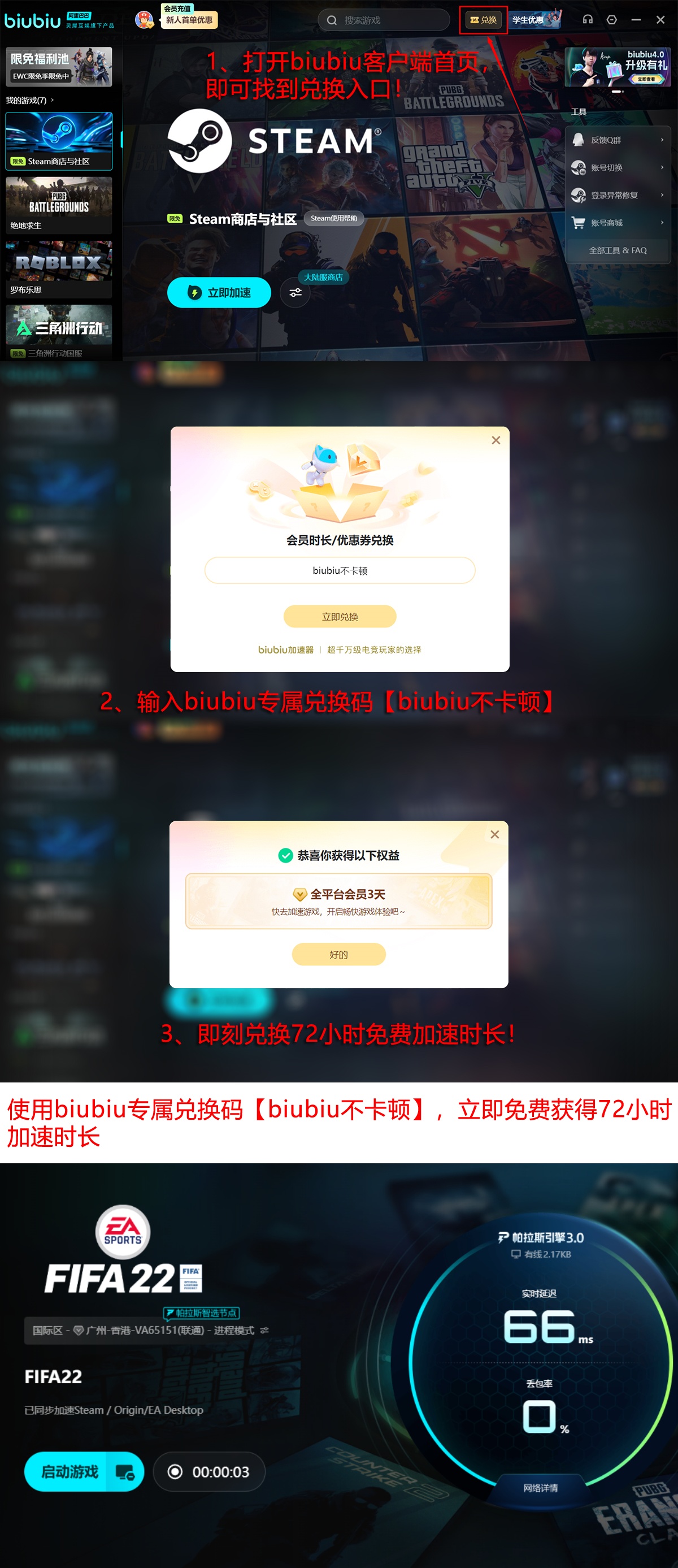 在服务权益方面,新注册用户首次登录即可获赠24小时全游戏加速权限,覆盖包括FIFA 22在内的上万款主流作品。此外,所有用户均可凭兑换码【biubiu不卡顿】额外领取3天免费使用时长,累计享有总计96小时的深度体验周期,便于全面评估其实际加速效果与适配表现。