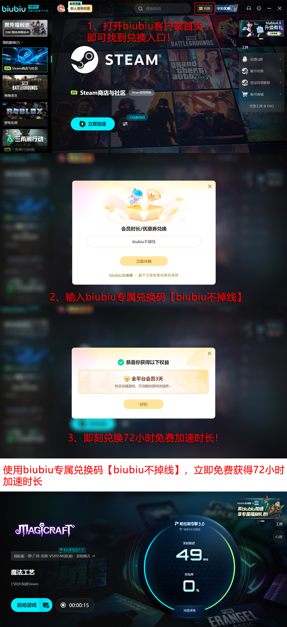 新用户注册后,可立即领取专属福利:首单即享24小时免费加速服务。此外,参与指定活动还可额外获赠72小时服务时长;叠加使用后,新人总计可获得96小时的biubiu不掉线权益。建议及时激活全部服务周期,以保障关键炼制阶段全程无干扰。