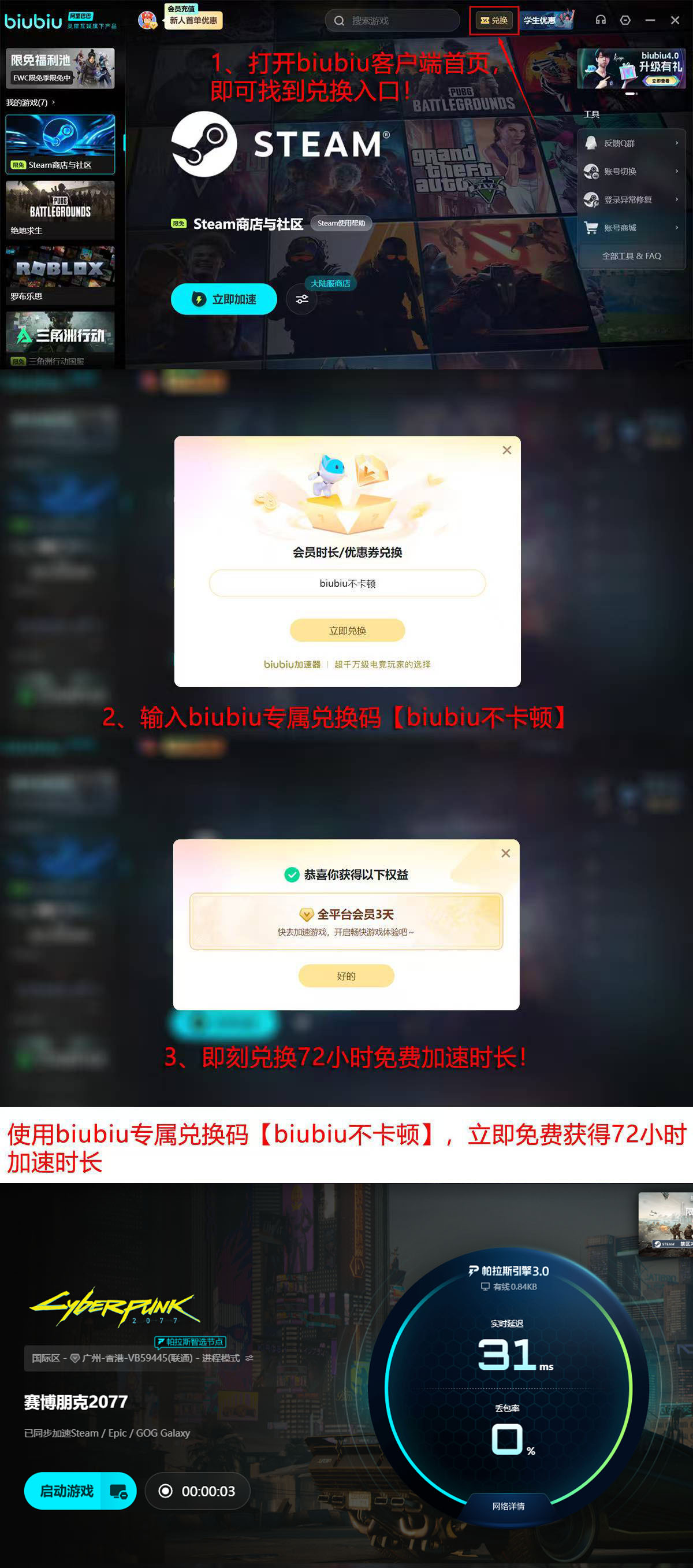 目前官方面向新用户提供双重时效福利:完成账号注册后系统将自动发放24小时高级会员权限;另可通过首页“兑换”入口输入口令【biubiu不卡顿】,即时领取额外72小时使用权。两项叠加后,单账户初始可用时长可达96小时,建议用户开通后立即启用以获得完整体验。