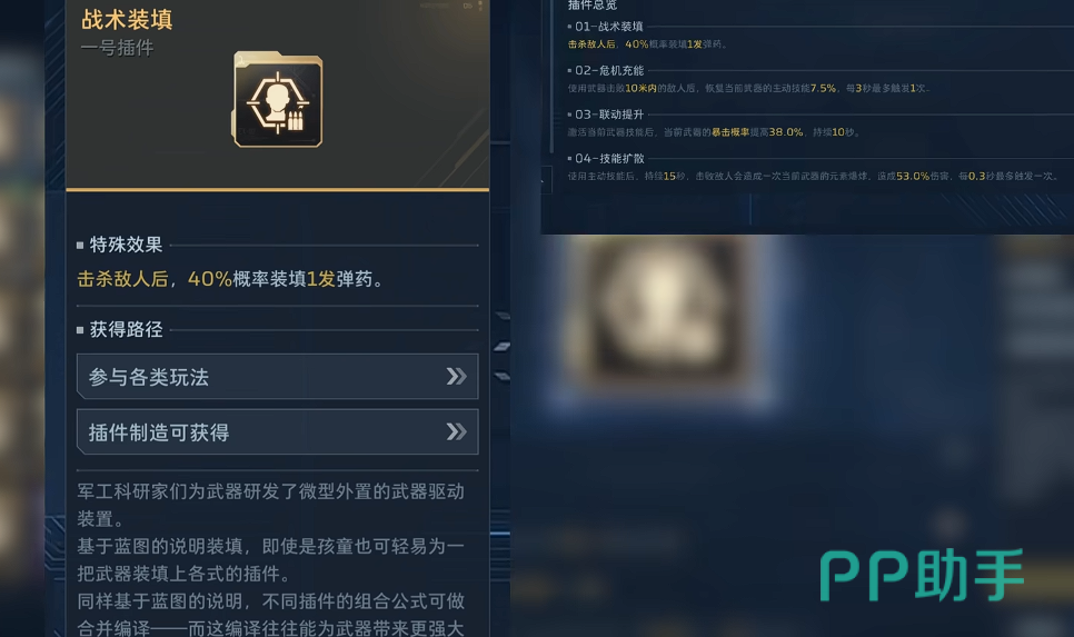 插件方面选择装束装填,这个插件的效果就是击杀怪物有概率获得子弹,这个效果对于黑火黑克勒提升幅度还是很大的,因为黑火黑克勒射击需消耗的子弹数量极大,很容易会出现子弹缺失的情况,但是装备了这个插件以后,就可以源源不断地进行输出,提高了整体的输出以及续航能力。