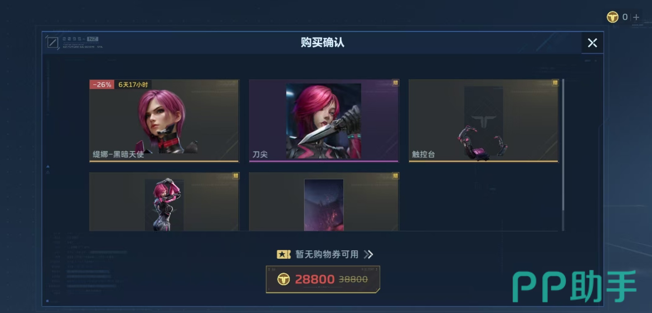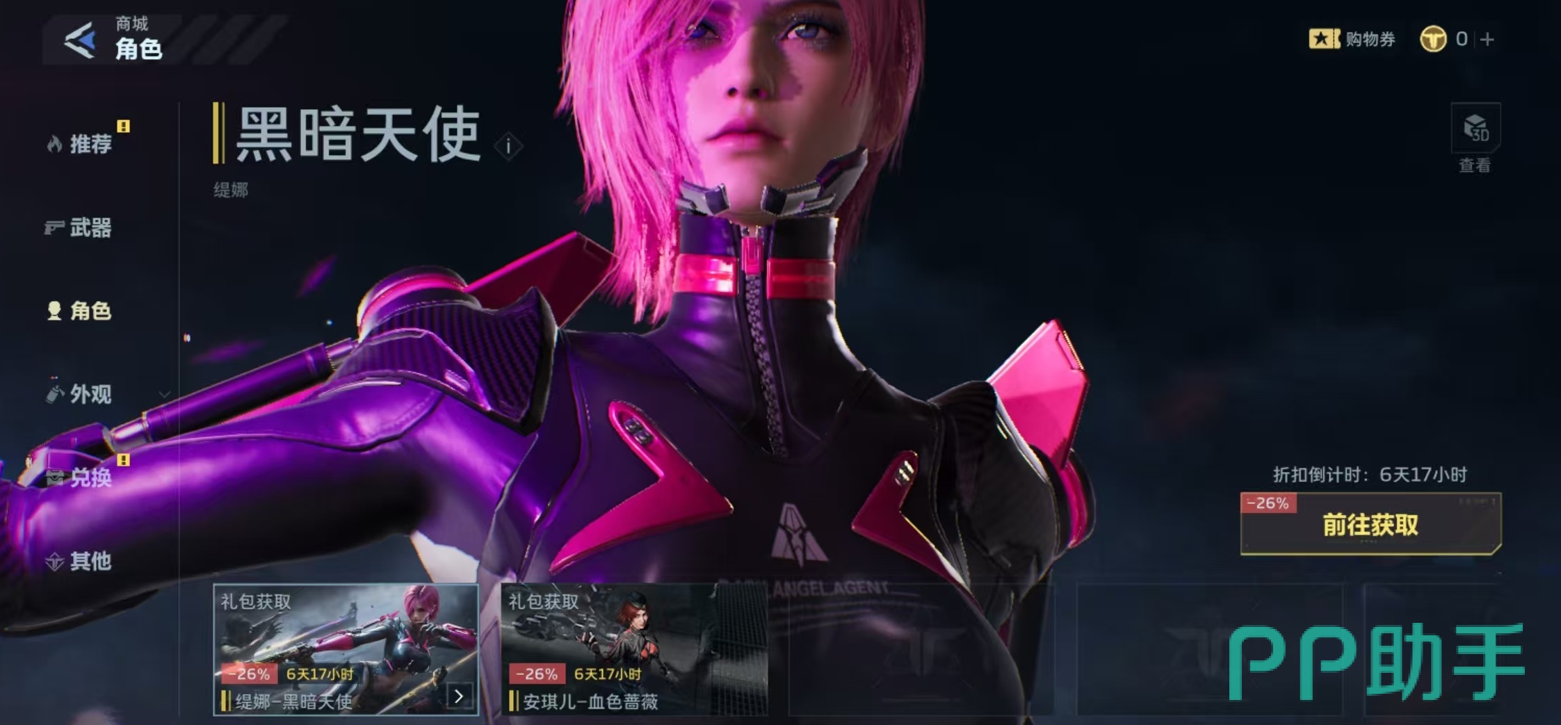 点击进入到商城选项,在商城中找到角色,就可以看到当前两个角色礼包,其中一个就是缇娜黑暗天使礼包,直接购买就可以获得,现在购买还有折扣价,原价38800点NZ点,现价只需要28800点,拥有26%的折扣,所以现在入手最为划算。购买礼包之后,除了可以解锁该角色之外,还可以获得其他赠品,例如头像刀尖,底座触控台,立绘黑暗天使和背景粉墨杀机等。