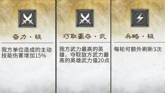 初始效果只推荐大家选3个,分别是提供15%的主动技能增伤的奋力·极、通过夺取敌方高武力英雄的20点武力值来提高容错的豪夺·武,以及获得每轮额外刷新3次的效果的兵略·极。