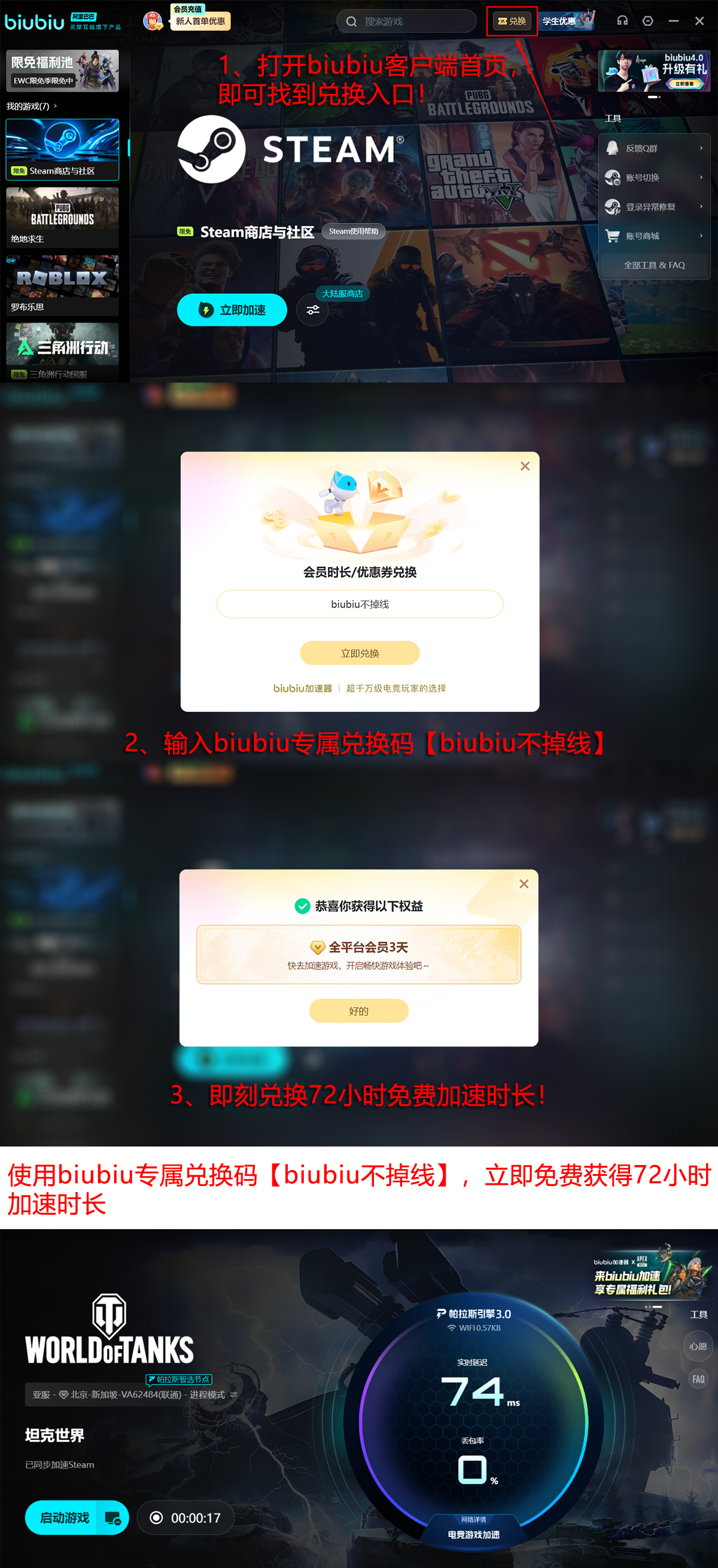 新用户完成注册并首次登录后,系统自动发放基础礼包,内含24小时免费加速时长。此外,首页活动入口同步开放【biubiu不掉线】专属兑换通道,可额外领取72小时加速权益。两项叠加后,新用户最高可累计激活96小时连续使用权限,建议及时领取以保障初期对局体验流畅性。