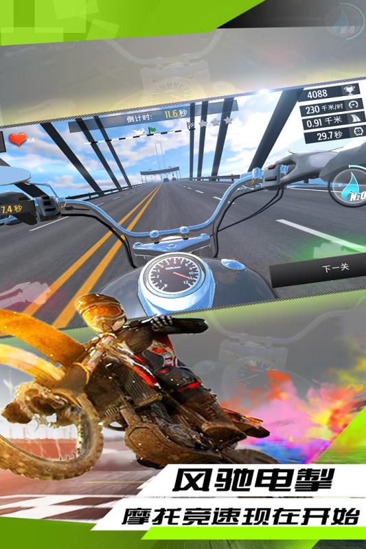 主打高空极限特技表演,轨道结构突破常规物理逻辑,呈现悬空回环、倒置螺旋、断桥飞跃等高风险路径设计。全场景采用动态摄像机追踪,强化失重与翻转体感。内置三十余种可切换摩托车,各型号在重量分布、加速响应与空中姿态控制方面存在明显差异,影响特技完成质量与评分结果。