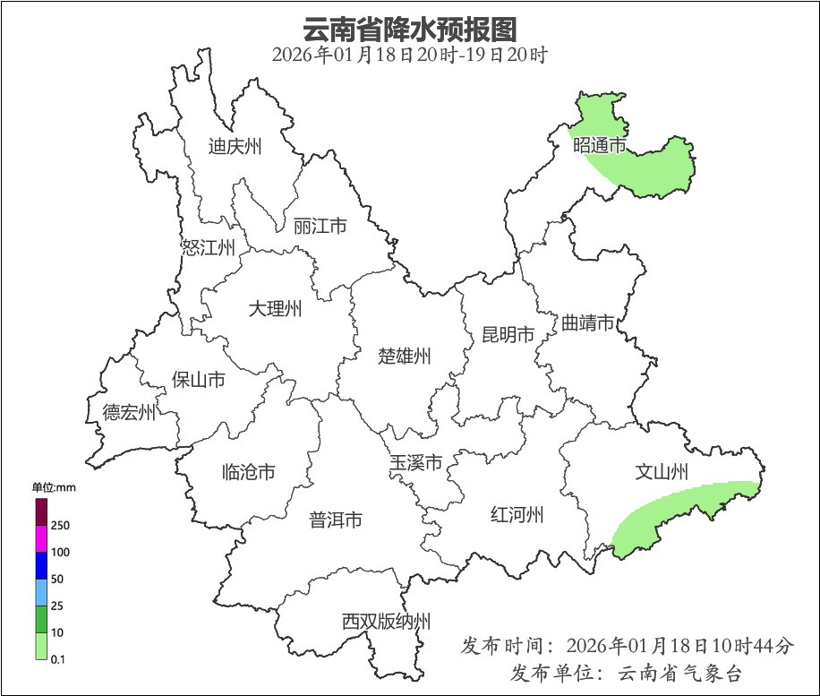 1月18日20时到1月19日20时:昭通市北部阴有小雨,文山州南部多云有阵雨,其他地区晴。