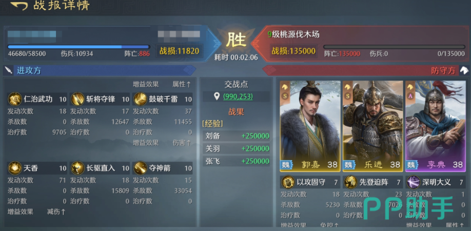 被动战法【德安天下】进一步强化其持续作战能力:普攻有20%基础概率触发兵力回复;若目标处于虚弱状态,则触发率额外提升10%,即最高达30%。该效果每秒均可独立判定一次,配合高攻速配置,可实现高频次、低延迟的自我续航,在多线作战或持久拉锯战中显著提升容错率。