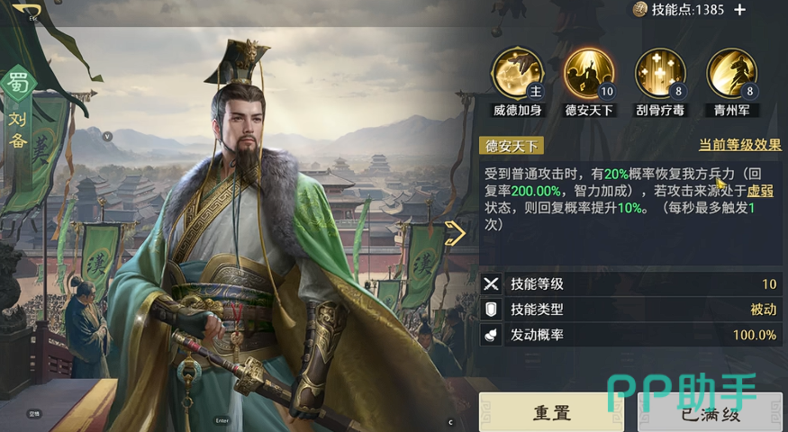 刘备最突出的战术特性在于“跨队治疗”——该效果为全服唯一,无其他武将可复现。其主动战法【威德加身】在战斗初始即为自身赋予100点怒气,大幅缩短首技释放节奏;同时,该技能可覆盖相邻两名友军,提供兵力恢复,并附加持续9秒的10%全队增伤效果。值得注意的是,此增伤与减伤效果同步生效:当敌方发起攻击时,刘备及周围两名队友将同步获得9秒内10%所受伤害降低,形成攻防一体的双模辅助循环。
