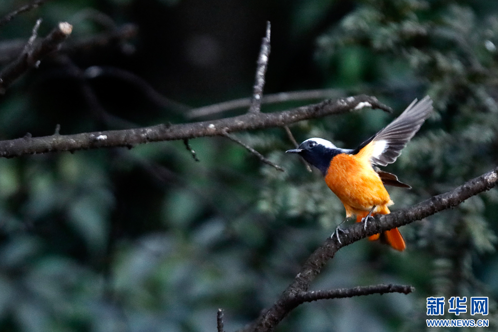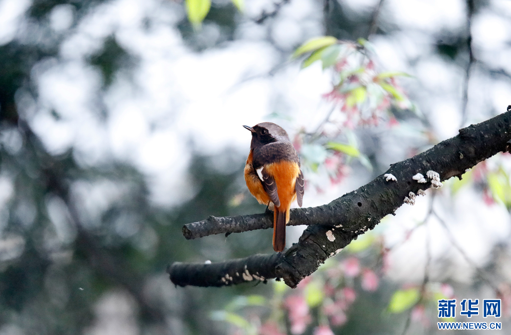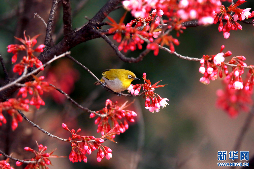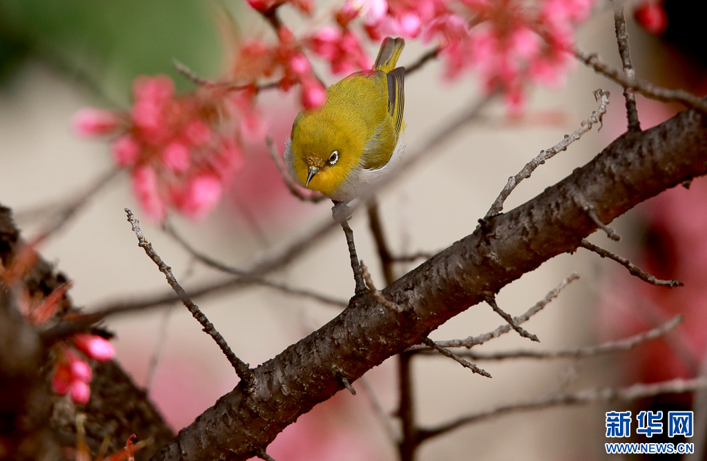 傲立冬樱花间的鸟儿(1月13日摄)。新华网发(马卫忠 摄)