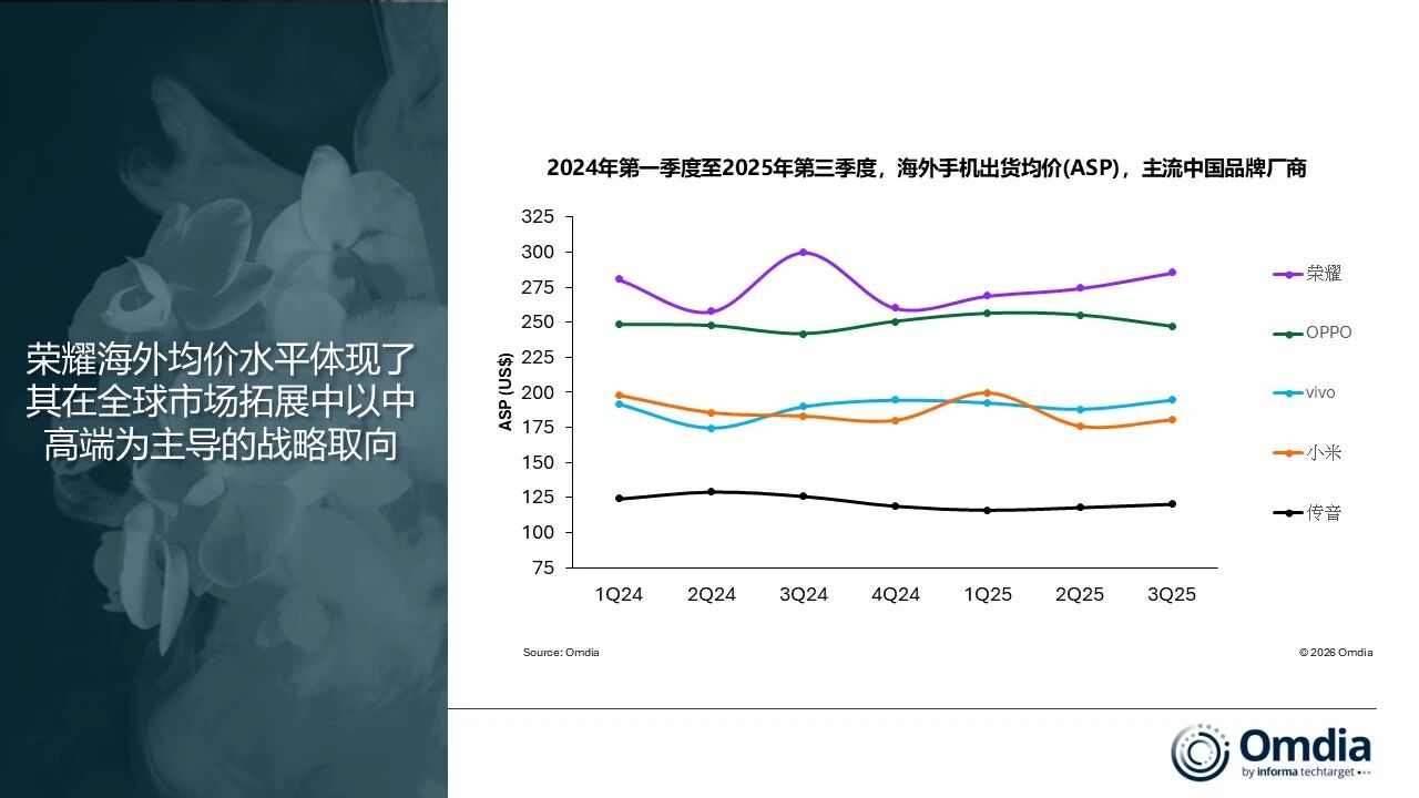 更值得注意的,是产品结构的变化。在多数新兴市场,200美元以下仍然是竞争最激烈、也是利润率最低的价位段,许多厂商依然高度依赖这一市场获取规模。但2025年,荣耀在海外市场的资源投放明显向中高价位段倾斜。Omdia与Canalys的数据显示,2025年前三个季度,荣耀在300–499美元价位段的出货占比约为23%,在主要中国厂商中处于最高水平。