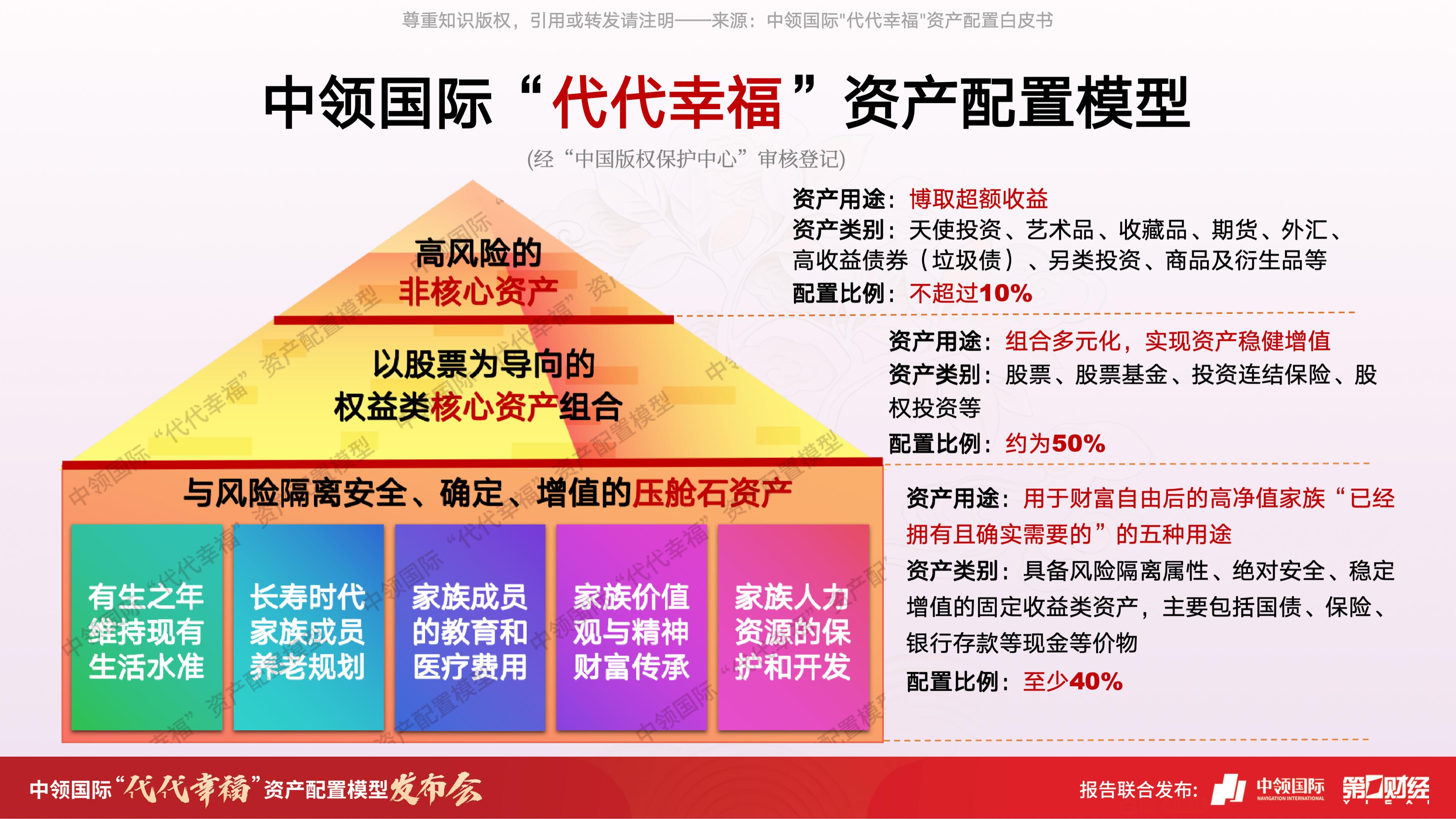 在1月17日召开的中领国际“代代幸福”资产配置模型发布会暨高净值家庭财富传承研讨会上,中领国际联合第一财经发布的《中领国际“代代幸福”资产配置模型白皮书》(下称“白皮书”),给出了破局答案。