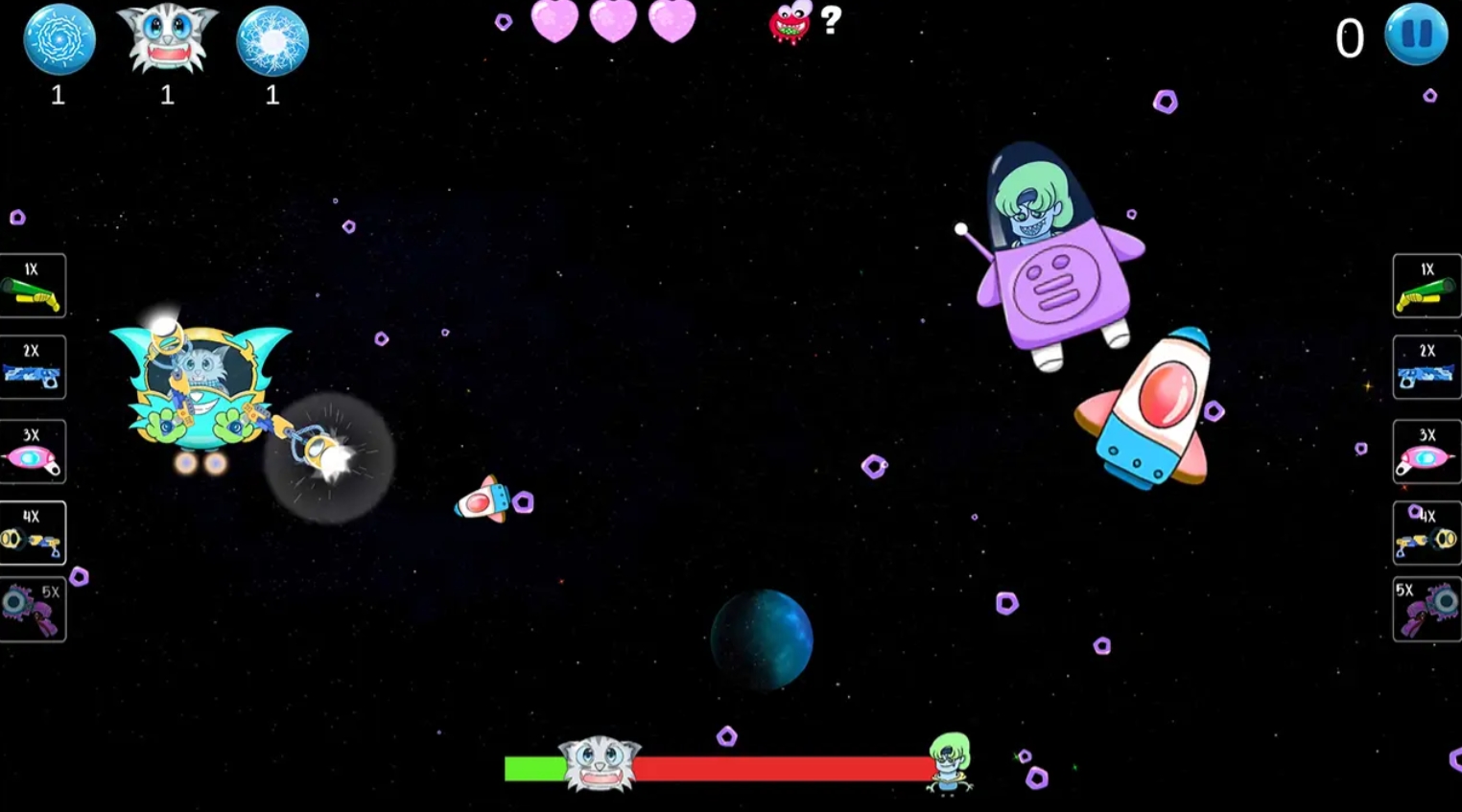 横版卷轴射击玩法,主角为具备航天装备的拟人化猫型英雄。主线围绕阻止苏醒的远古太空恶魔吞噬星域展开。敌方单位随关卡推进呈波次刷新,攻击模式含追踪弹、散射弹、扇形扫射及弹幕矩阵,密度逐级提升。玩家需依托掩体走位、精准把握弹道间隙实施闪避,并在安全窗口期集火输出。Boss战设计强调阶段转换与机制识别,考验操作稳定性与临场判断力。