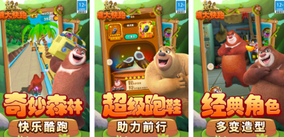 以《熊出没》动画为原型打造的竖版高速跑酷手游。玩家在超清森林、古镇、雪原等多变场景中操控熊大闪避障碍、滑行跃升、收集金币。角色初始造型严格遵循动画设定,后续可通过进度解锁百余套主题服饰,部分装扮附带属性加成,有效提升跑酷续航与资源获取效率。