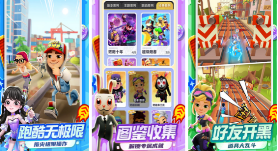 全球知名横版跑酷IP,玩家化身街头艺术家,在各国地铁轨道间高速穿梭,躲避巡逻警察与迎面列车。通过滑动、跳跃、翻滚等基础操作规避障碍,收集金币与磁铁、喷气背包等道具。难度曲线平滑递进,速度随进程提升,考验反应力与节奏把控能力;当前版本已实装冰雪世界主题地图与活动内容。