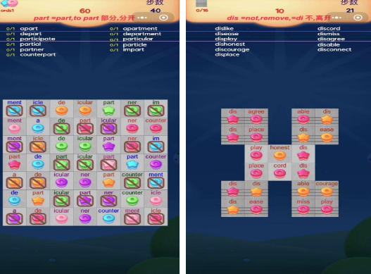 将语言学习自然嵌入消除玩法:每个关卡预设目标英文单词,玩家需拖动带有字母或完整单词的糖果,通过拼接方式组成对应词汇完成任务。词库覆盖基础高频词汇,拼写过程强化记忆路径,实现娱乐性与功能性双重价值,在潜移默化中提升词汇识别与拼写能力。