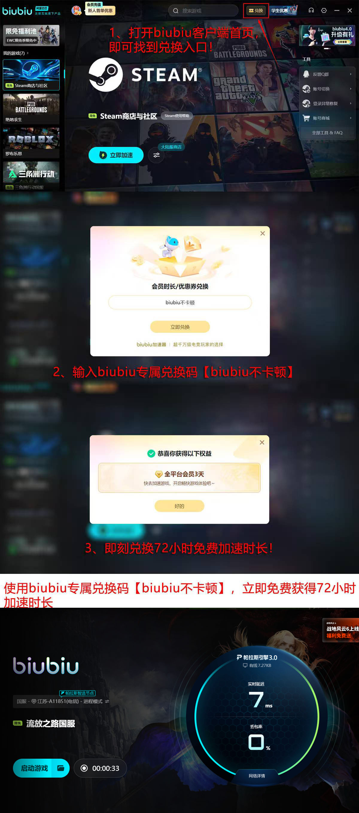 对于新用户,当前可享双重加速福利:完成安装并注册后,系统自动发放24小时免费使用时长;随后进入客户端首页,点击顶部“兑换”按钮,在弹窗中输入口令【biubiu不卡顿】(支持复制粘贴),即可额外领取72小时加速权限。两项权益叠加生效,总计可获96小时无限制加速服务,无需重复领取或担心时效抵扣。
