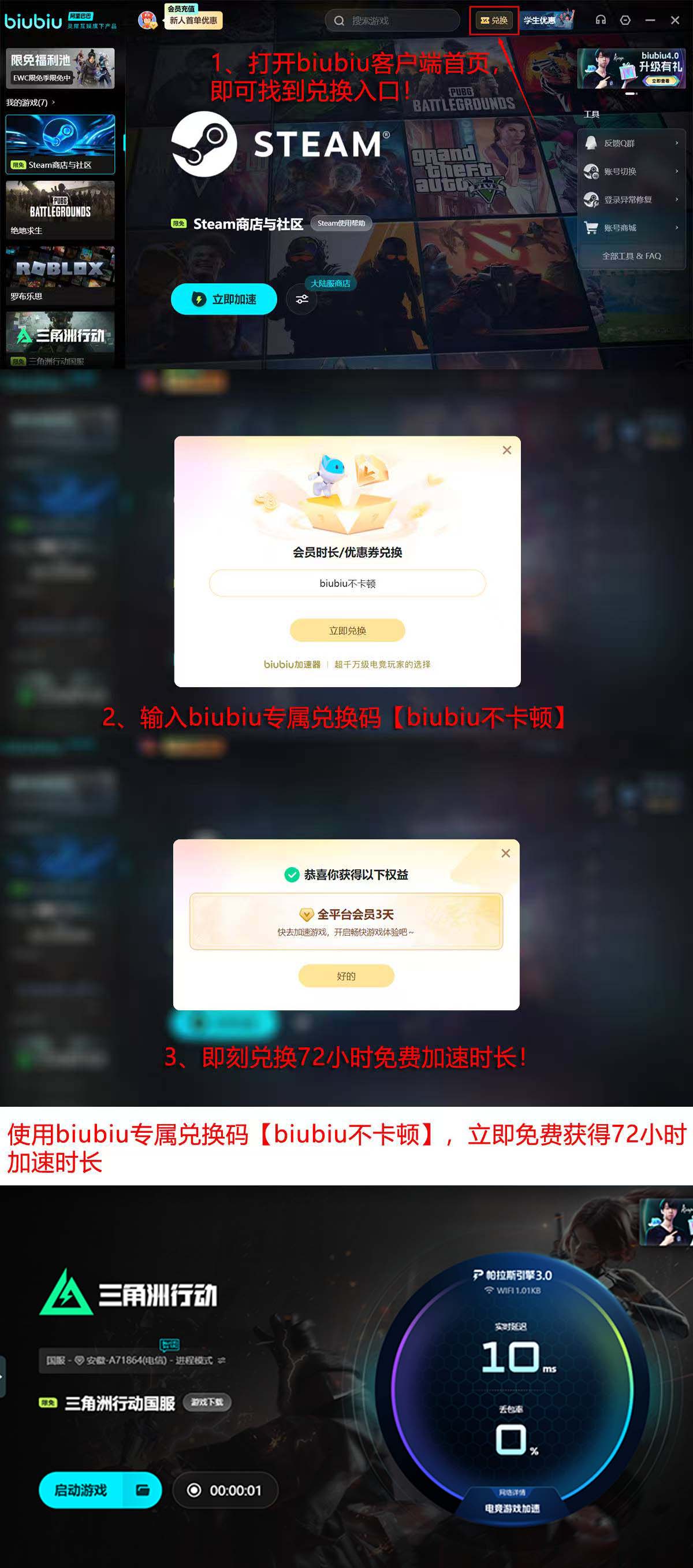 启用biubiu加速器后,《三角洲行动》玩家可感知明显改善:瞄准响应延迟降低、弹道同步更精准、交火过程中帧率波动减少,整体操作跟手感大幅提升。为便于用户体验效果,平台提供新用户专属福利:完成注册即可获赠24小时免费加速时长;登录后进入首页点击“兑换”,输入口令【biubiu不卡顿】,额外领取72小时使用权;两项权益可叠加,总计享有96小时无门槛试用期。