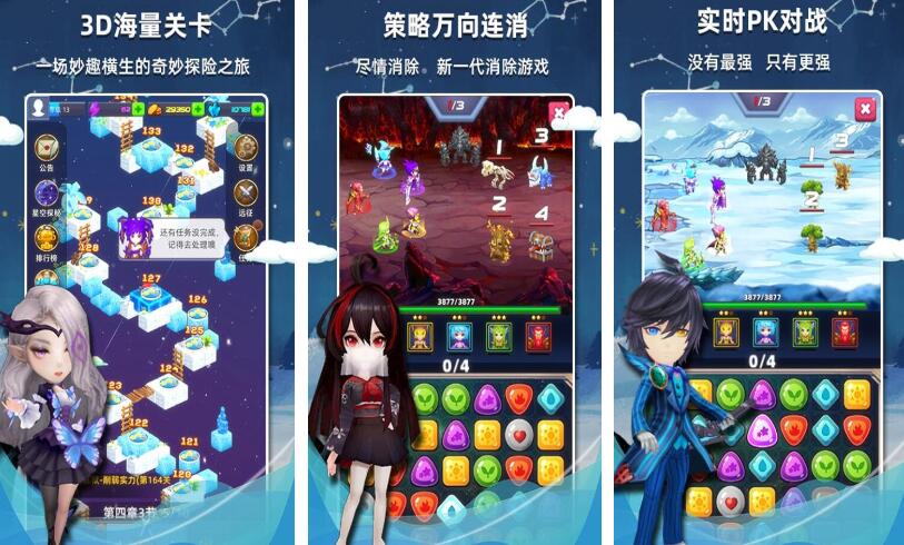 这是一款突破传统框架的三维三消作品。游戏构建了12位拟人化星座角色作为向导,带领玩家穿越百余个立体关卡。核心创新在于“万向联销”机制:图案支持全角度滑动与多维路径连接,彻底摆脱平面网格限制。此外,内置实时跨服PK系统,支持毫秒级匹配与动态段位结算,满足硬核消除玩家的竞技需求。