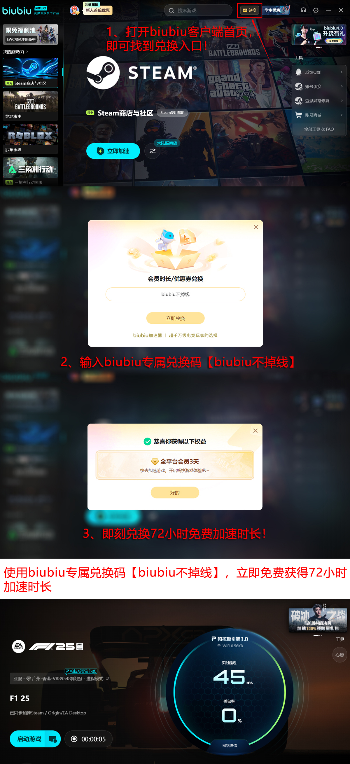 即日起新用户注册即可领取专属提速权益:输入激活码【biubiu不掉线】立即获得三天全功能试用期;完成账号绑定后额外加赠24小时服务时长,累计可用时长达96小时,支持跨运营商、多地区网络环境实测,充分验证加速效果。