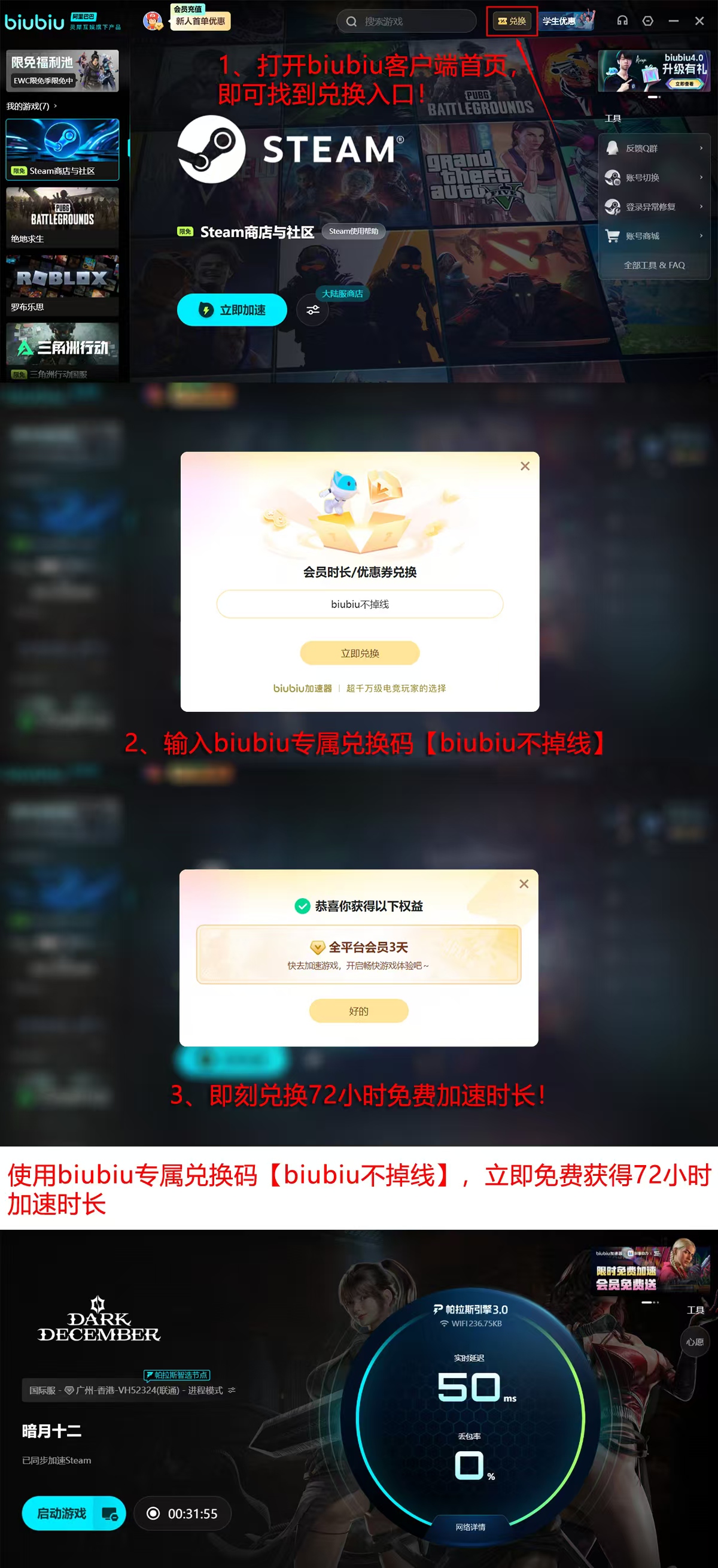 新用户注册后可立即启用全功能免费试用服务,首日享24小时无限制加速权益;完成指定步骤后,输入激活码【biubiu不掉线】,还可额外获得72小时进阶加速权限。合计可享96小时高品质网络优化体验,无需付费即可全面应对《暗月十二》运行过程中的延迟与断连挑战。