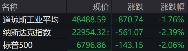►►美股三大指数大幅下挫,截至收盘,道指跌1.76%,标普500指数跌2.06%,纳指跌2.39%。三大股指均录得自去年10月10日以来的最差单日表现。大型科技股全线下跌,英伟达跌4.32%,苹果跌3.45%,微软跌1.16%,谷歌跌2.42%,亚马逊跌3.40%,Meta跌2.60%,特斯拉跌4.17%,博通跌5.43%,甲骨文跌5.85%,奈飞跌0.84%,英特尔涨3.41%。
