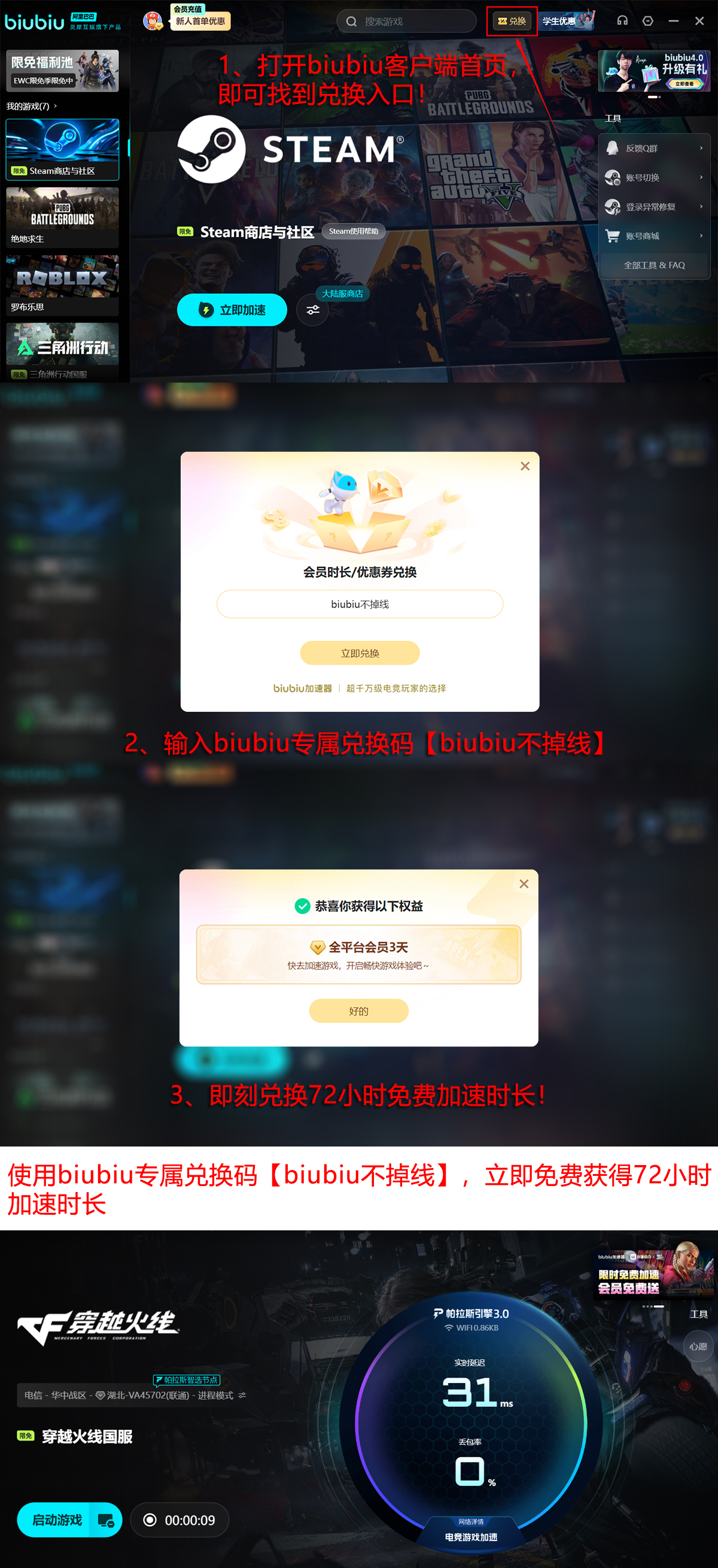 目前提供便捷的免费试用通道:在兑换入口输入激活码【biubiu不掉线】,即可领取3天使用权;叠加新用户注册即赠的24小时时长,总计可享96小时无限制加速服务。