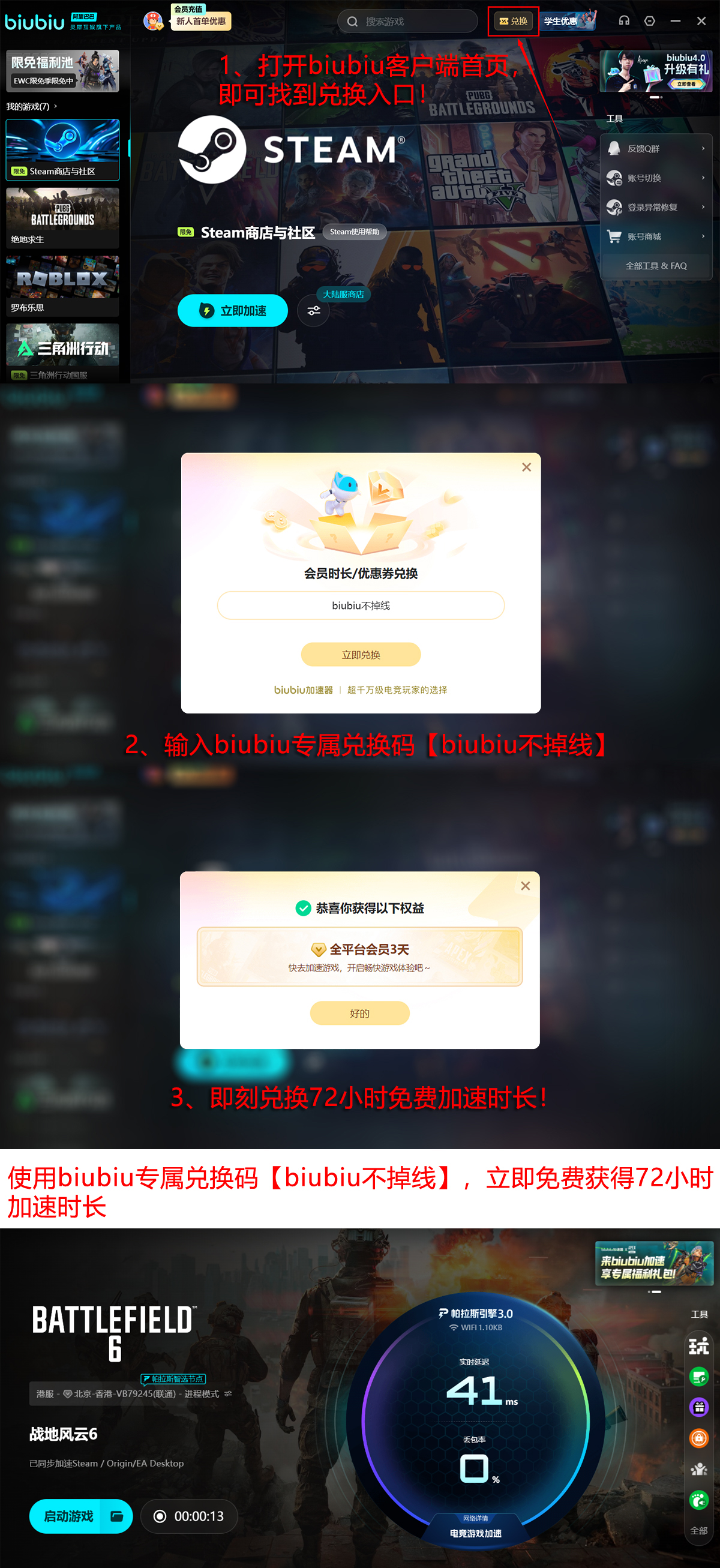 当前平台提供便捷试用通道:进入兑换页面,输入激活码【biubiu不掉线】,即可领取3天使用权。叠加新用户注册自动发放的24小时体验时长,总计可获得96个小时的完整服务周期。