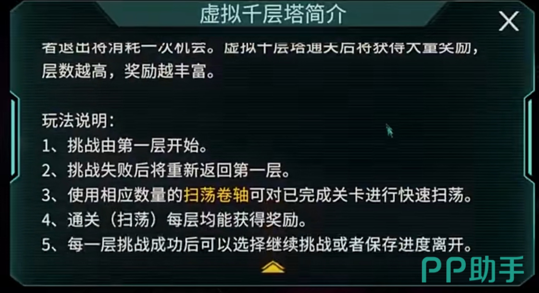 虚拟千层塔就是一座用来获取大量奖励的挑战塔,层数越高,能够给玩家带来的奖励就越多。其玩法说明为1.挑战由第一层开始;2.挑战失败后将重新返回第一层;3.使用相应数量的扫荡卷轴可对已经完成的关卡进行快速扫荡;4.每层通关后均能获得一定的奖励;5.每一层挑战成功后都可以自由选择继续挑战或保存进度离开。