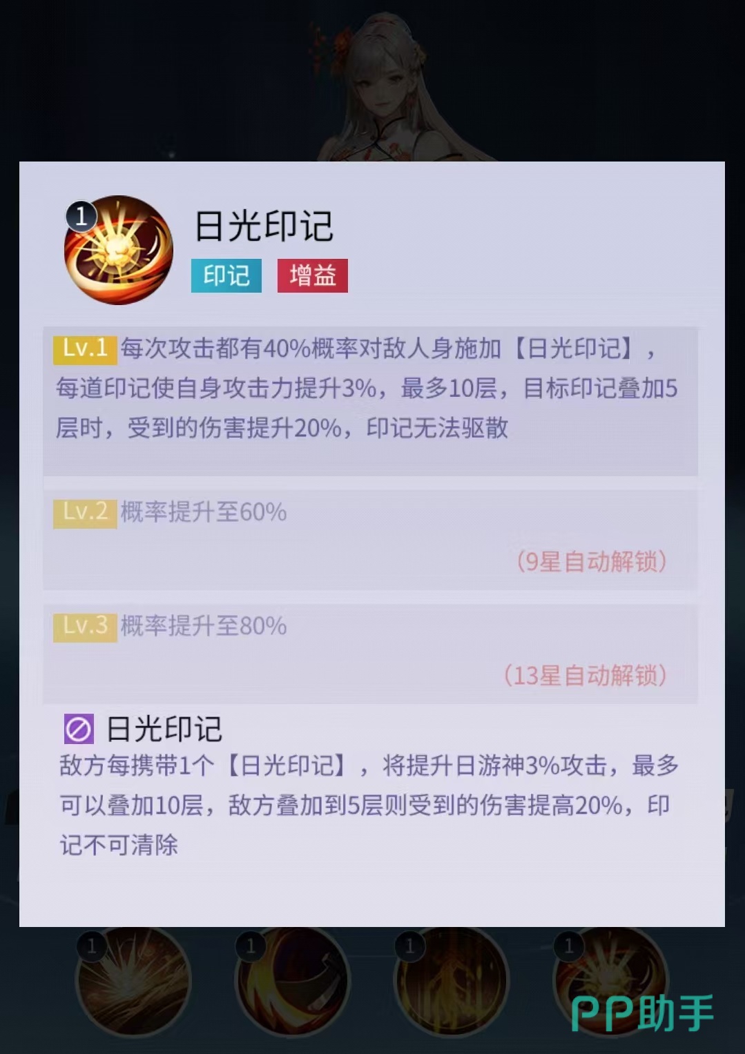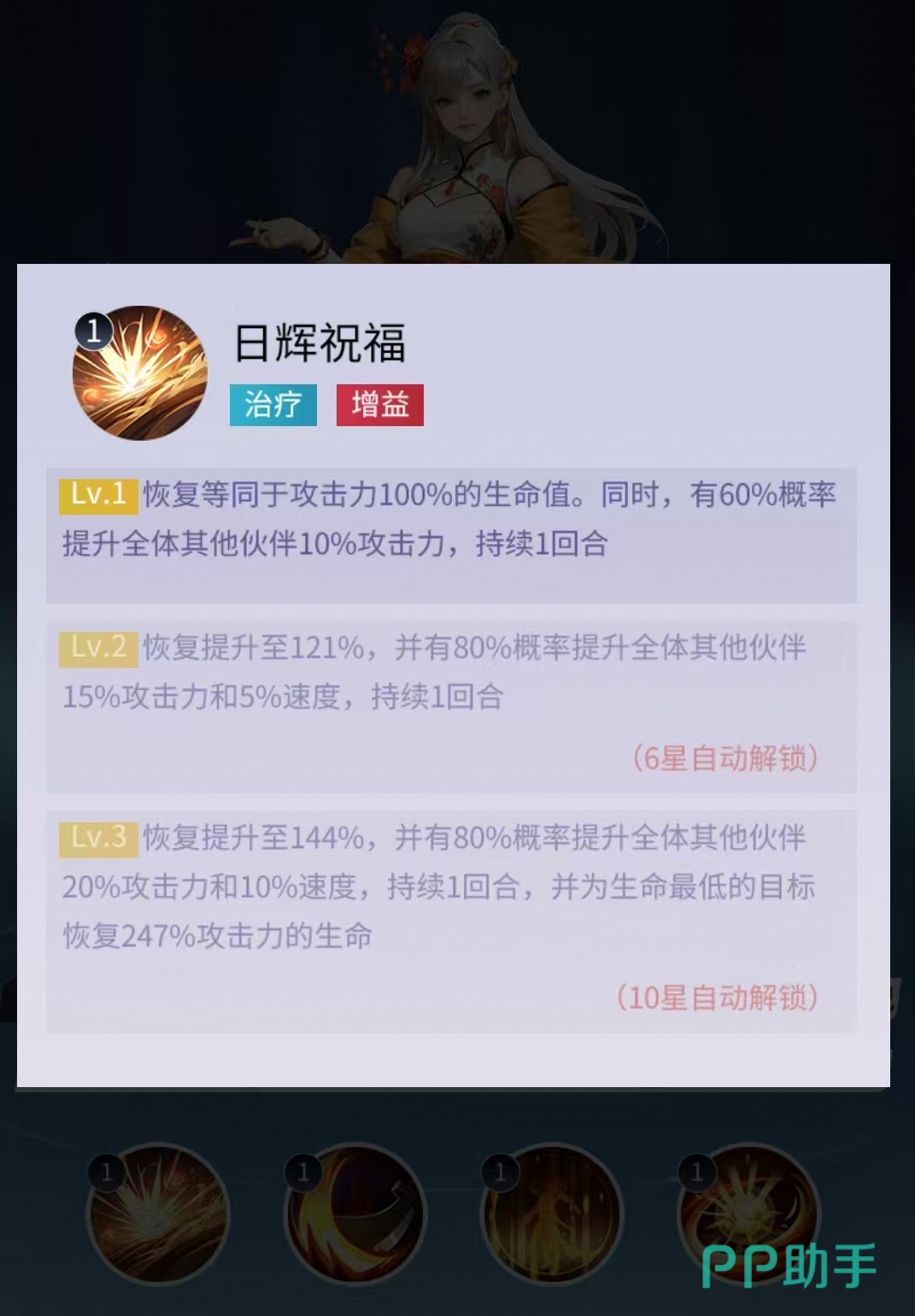 第二个技能属于自身的普攻,可随机伤害三个目标,比较中庸的技能。被动也是提升攻击力、生命值和治疗效果。大招在每次攻击时,都有几率给敌人身上施加日光印记,每到印记可以增加自身3%攻击力,最多叠加10层。目标身上的印记叠加5层时,受到的伤害提升20%。这个技能效果提升自身攻击力也就增加了治疗的能力,提高对方受到的伤害,也就辅助我方更好的输出,所以这个治疗在战斗方面还是比较全面的。