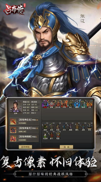 基于经典三国题材构建,采用纯黑底色界面设计,突出角色立绘与棋盘信息,视觉简洁高效。战斗系统支持兵种协同(步、骑、弓、车)、技能联动与地形加成,每关设有明确胜利条件(如斩首敌将、坚守三回合)。武将成长路径清晰,可通过升级提升武力、智力、统率等核心数值,强化个体战力的同时优化团队战术容错率。
