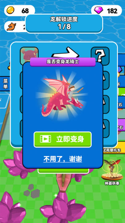 采用西方古典巨龙为原型,融合暗黑系、机械系等多重终极形态设定。主角为风格化橡胶人形象,通过采集野外水晶资源提升龙体品质;地图中随机分布各类恐龙蛋供收集;新增“恶龙入侵”事件副本,触发龙骑士合体战斗机制,实现人龙一体协同出征。