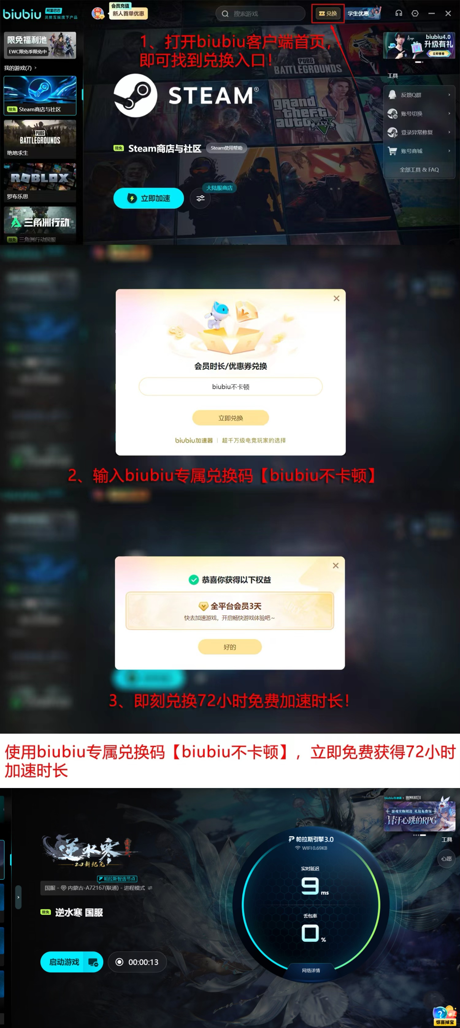 技术价值需通过真实使用验证。为降低体验门槛,biubiu加速器面向新用户提供免注册即享的24小时全功能试用权益。此外,平台同步开放【biubiu不卡顿】专属兑换码,所有用户(含新老账号)均可凭此激活连续3天的完整加速服务,充分覆盖多周期游戏场景,确保玩家有充足时间评估其在不同网络环境下的实际表现。