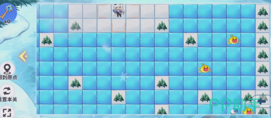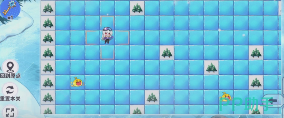后续向下推进过程中,仍将遭遇至少一处史莱姆。绕行原则不变:保持当前行号,仅向右平移一格,即可避开。完成此次绕行后,将抵达一个特殊冰块——其右侧紧邻神秘宝箱。使用此前获取的钥匙开启宝箱,此时切勿继续向前滑行。立即调整方向,转为向下移动,持续滑至贴近右侧树林边缘;随后可见右侧出现一块无冰裸地区域,进入该区域后,正下方即显示终点标识——一面小旗。点击进入该区域,即判定通关成功。