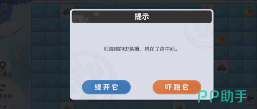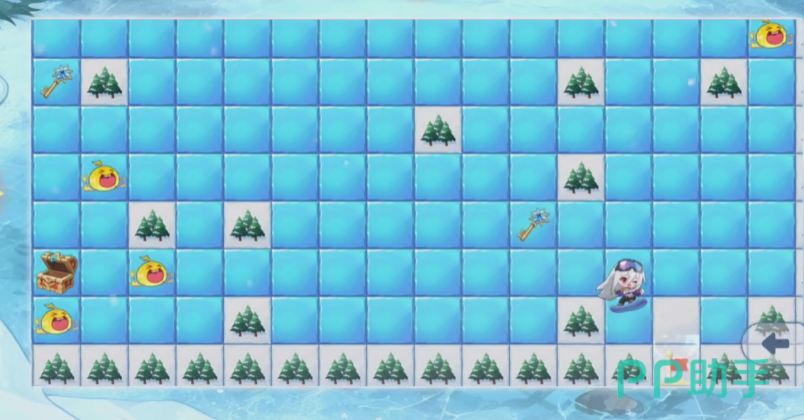 该关卡为网格化冰面地图,玩家需在80步内抵达终点小旗位置。所有移动均沿冰块方向滑行,遇障碍物会触发转向提示——冰面上浮现清晰箭头,指示下一步滑行方向。关键交互对象包括三类:宝箱(需钥匙开启)、钥匙(可拾取)、史莱姆(不可接触,必须绕行)。其中,拾取钥匙是开启宝箱的前提,而宝箱内藏有推进流程的关键线索或道具。