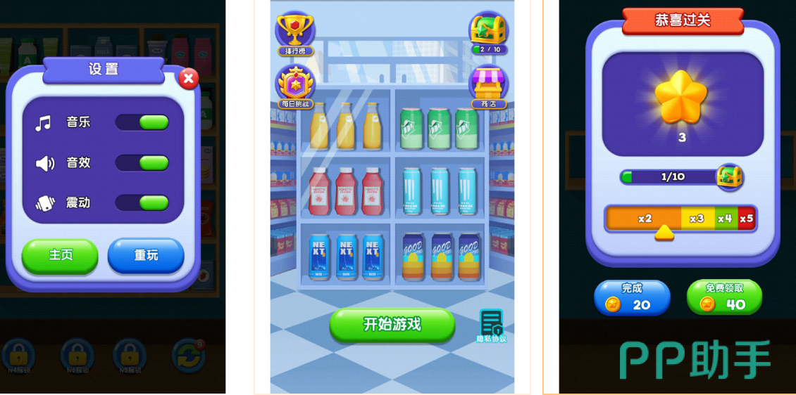 游戏将现实仓储逻辑转化为消除规则:商品以多层货柜形式陈列,玩家通过拖拽交换相邻物品位置,达成横向或纵向三连即可清除对应货格。随难度提升,货柜层数递增,并引入带锁保险柜等特殊结构,需先获取对应钥匙方可开启。写实建模与拟真碰撞音效强化操作反馈,营造出秩序重建带来的心理舒缓效应。