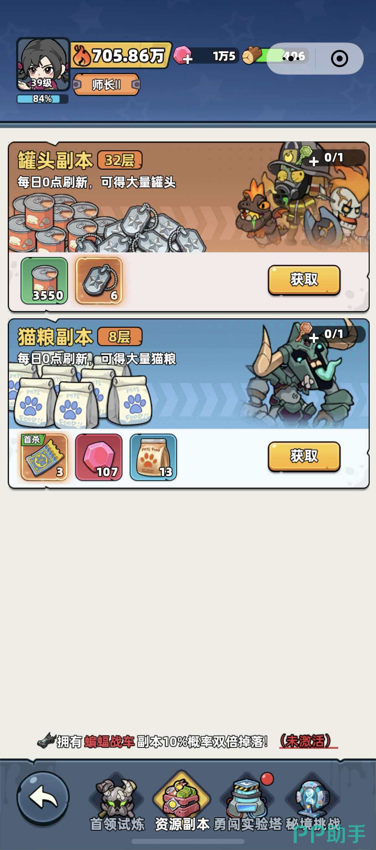 除木材外,游戏中还有多项关键基础资源需同步积累。罐头作为核心升级材料,可通过挑战副本、挂机工厂产出及击败怪物三种主要途径获取;钞票则用于招募幸存者,完成全部初始招募后,升星所需碎片同样来源于招募池;猫粮专用于提升宠物等级,其来源包括猫粮专属副本、宠物招募以及房间探索奖励等多元化渠道。