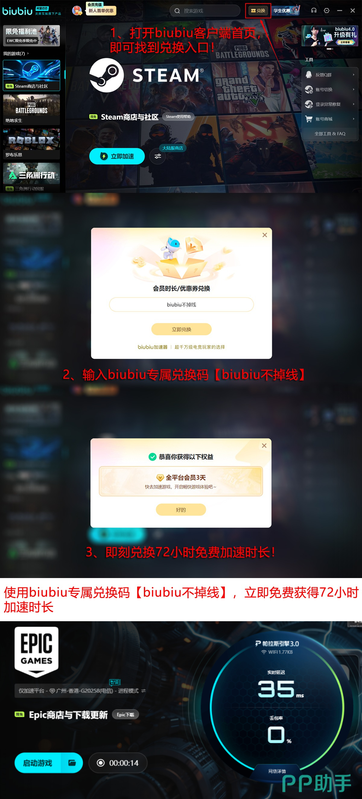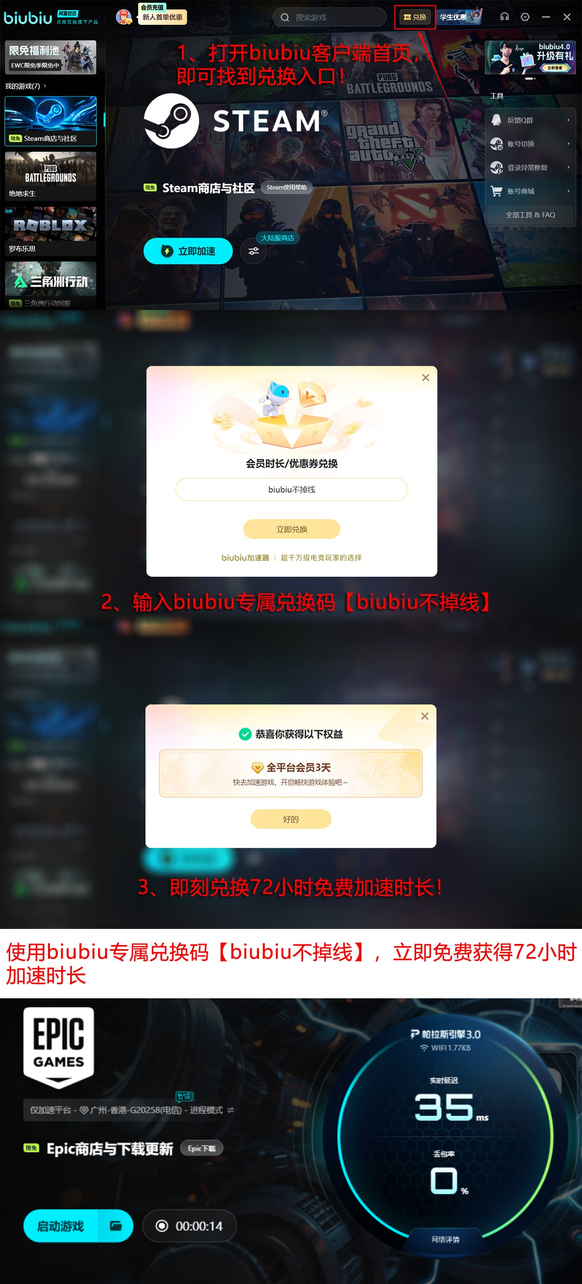 面向新注册用户,biubiu加速器推出阶梯式体验计划:完成账号激活即可获赠首日深度优化服务24小时;输入专属兑换码【biubiu不掉线】,还可额外解锁72小时全功能加速权限。两项权益叠加,新用户可连续享受顶级网络加速服务长达96小时。