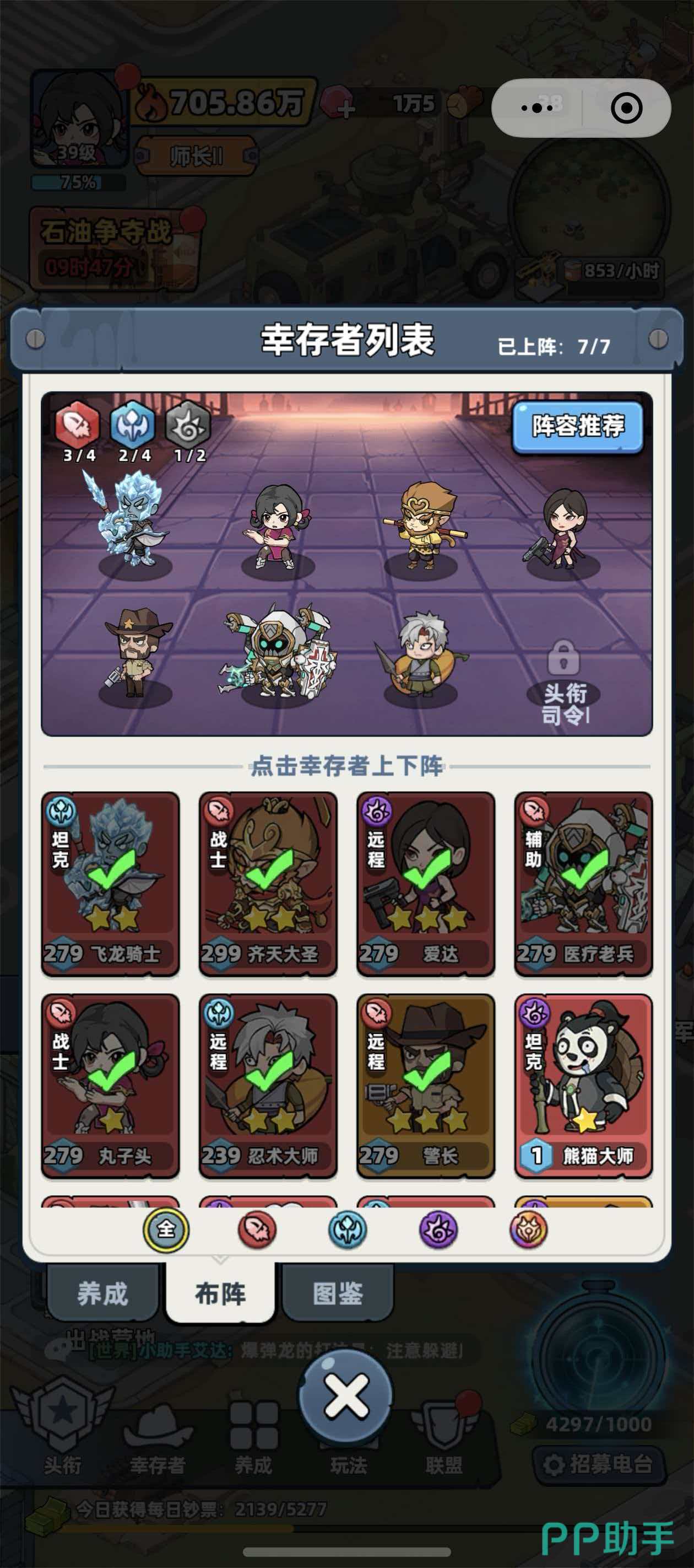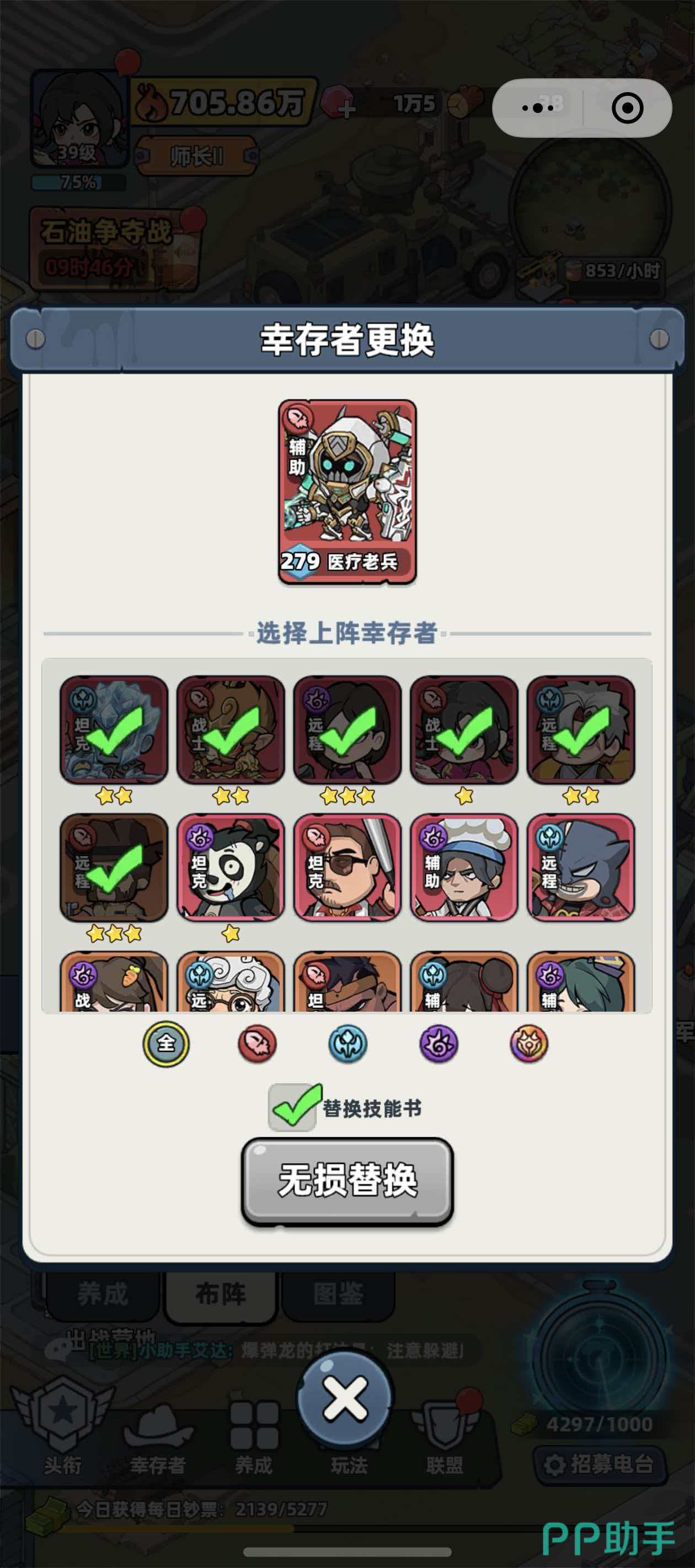 角色更换入口位于主界面底部导航栏。点击【幸存者】进入角色管理页后,系统将完整展示已获取的所有幸存者。页面底部设有【养成】【布阵】【图鉴】三个功能标签,需切换至【布阵】模块。在此界面中,点击当前阵容中任一上阵角色(例如医疗老兵),即可唤出替换面板。面板下方将列出所有可选幸存者,选择目标角色后点击【无损替换】按钮即可完成切换。特别注意:务必勾选【同步技能书】选项,确保新角色直接继承原技能配置,避免手动重配带来的资源浪费与操作延迟。