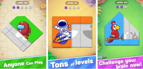 结构化折纸教学工具,内置动物园、交通工具、节日装饰等多主题场景。每关提供带虚线折痕的数字纸模,配合分步动画演示,引导儿童按序完成谷折、峰折等基础技法,最终生成立体图形。